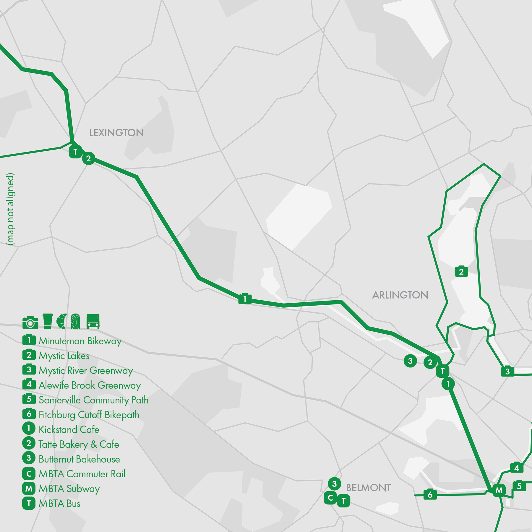 Runners can easily connect onto Minuteman Bikeway from Somerville Community Path (Route 13), Fresh Pond and Alewife Brook Greenway (Route 14), and Mystic River Greenway (Route 16).