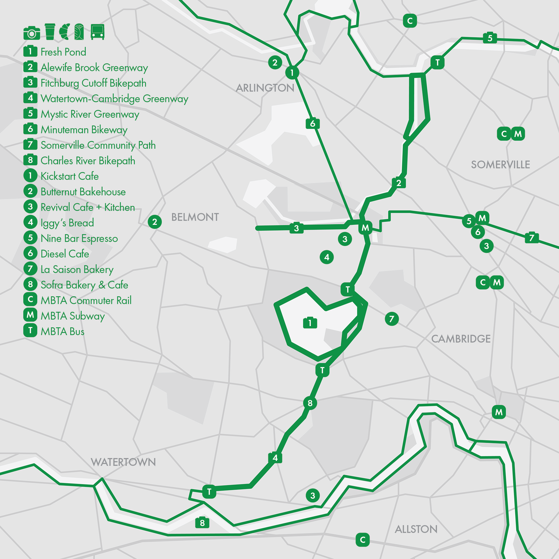 Fresh Pond can be connected to the Charles River Bike Path via the Watertown-Cambridge Greenway to the south, and to the Mystic River Greenway via the Alewife Brook Greenway to the north.
