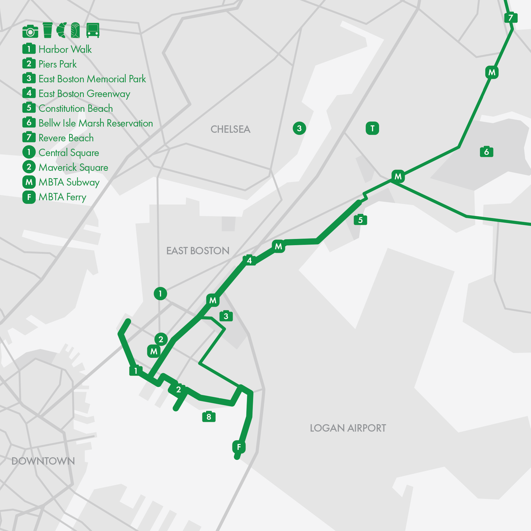 Transit / The East Boston Greenway has convenient access from MBTA Blue Line stations such as Maverick (East Boston's downtown area), Airport, and Wood Island. An alternative option is the MBTA Ferry, which offers infrequent service between the Logan Airport Ferry Terminal and Long Wharf in Downtown Boston.