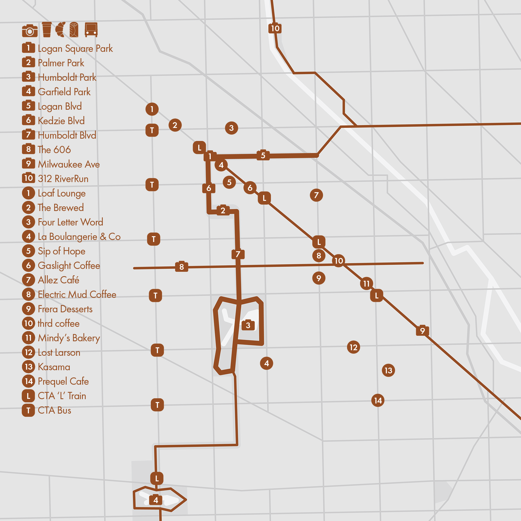 Cafe / Besides a few great coffee shops nearby the route, Lincoln Square and Logan Square are two vibrant neighborhoods flanking the route, each boasting an abundance of cafes.