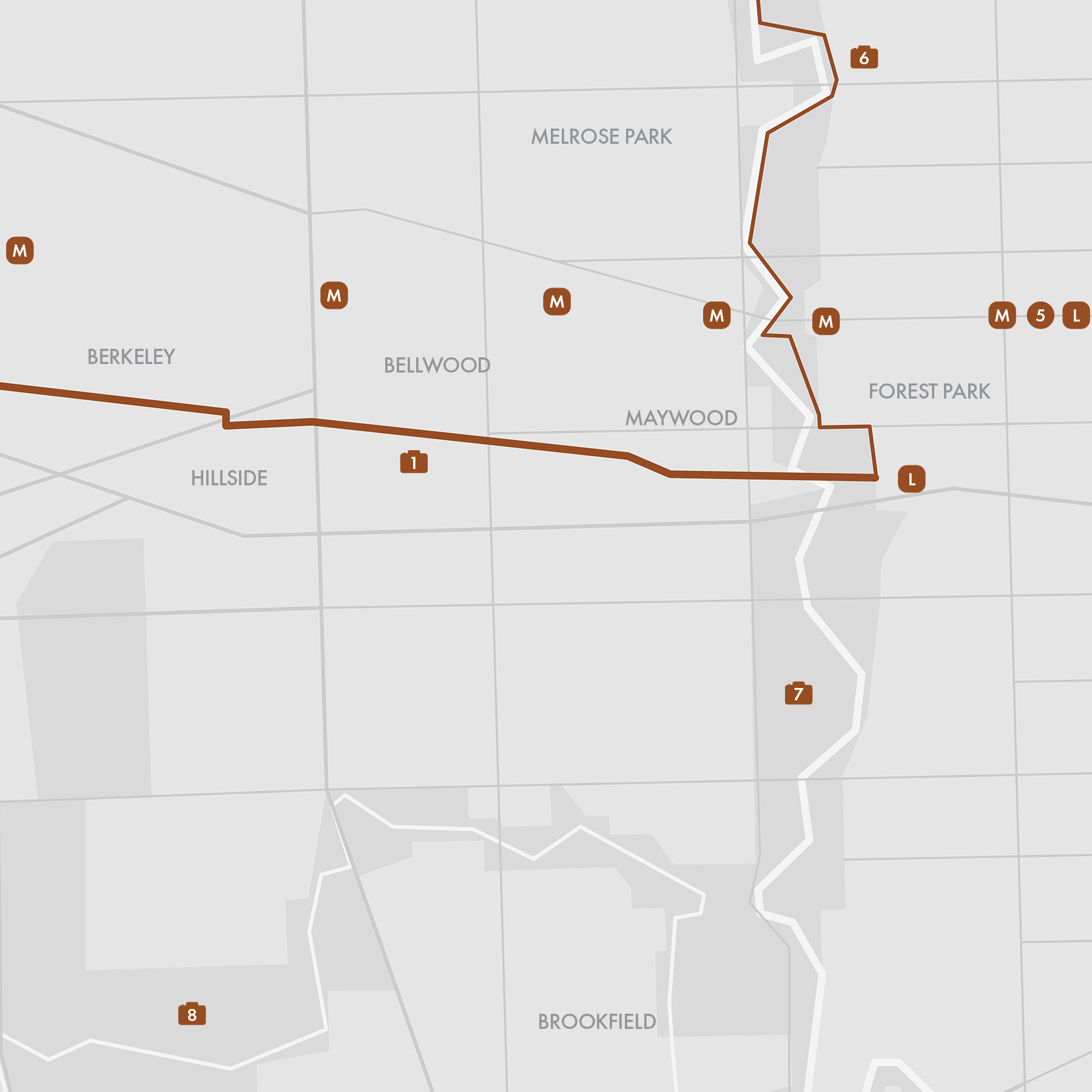 Transit / The Main Stem starts at the CTA Blue Line's Forest Park terminus and runs somewhat parallel to the Metra UP-W Line. On the Elgin Branch, Elgin is served by the Metra MD-W Line, while West Chicago and Geneva are on the UP-W Line. On the Aurora Branch, both Aurora and Naperville are on the Metra BNSF Line.